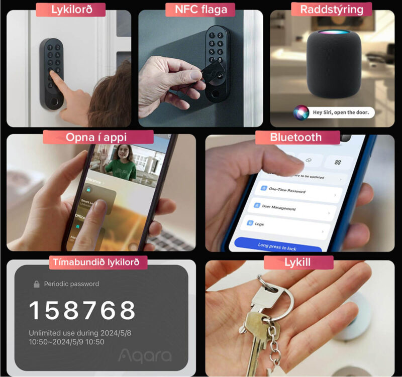 Fylgir NFC flaga sem hægt er að setja á lyklakippu ásamt hlíf yfir lásinn í viðarlit.